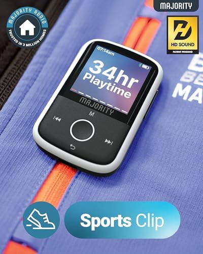 MP3 Player with Bluetooth and Sports Clip Earbuds Included, Expandable to 128GB Bluetooth MP3 Music Player, HD Color Screen, 34 Hours Battery Life SD and USB-C Majority MP3 GO Music Player