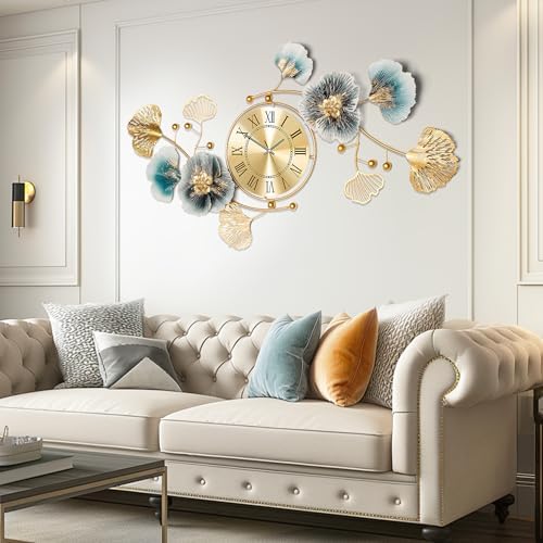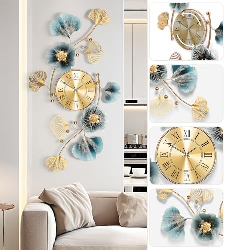 Axioglo Large Wall Clock,3D Creative Metal Ginkgo Leaf Decoration Clock, with Silent Movement Decorative Wall Clock,Large Wall Decor, for Living Room Bedroom Kitchen Office(32''x18'' )