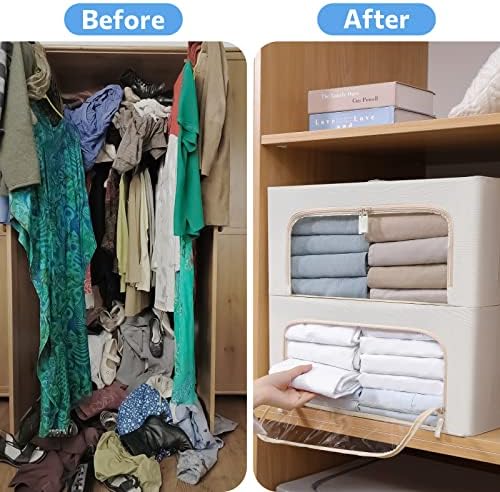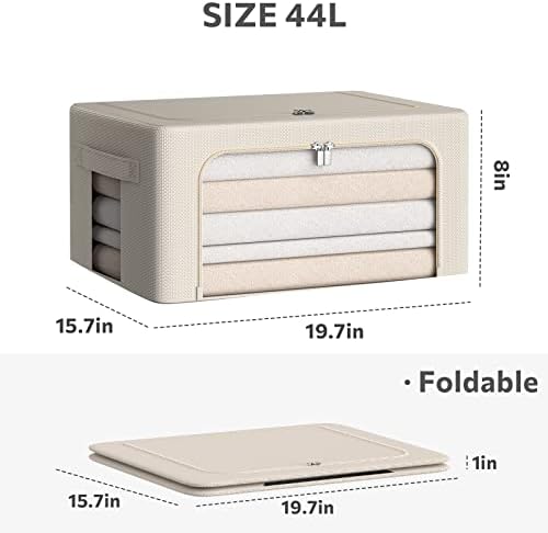 3Pack Frame Storage Box - Clothes Storage Bin Bags Oxford Fabric Foldable Stackable Container Organizer Set with Clear Window & Carry Handles (Beige, Medium-44L)