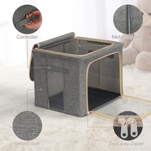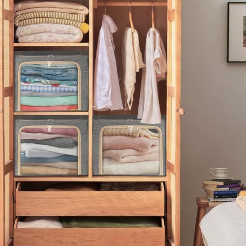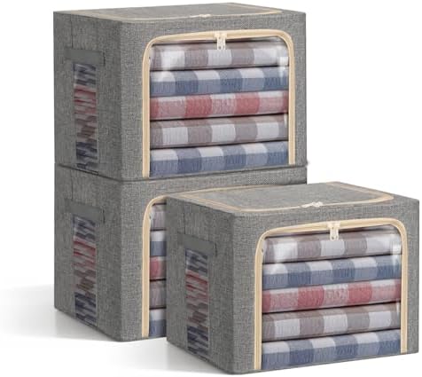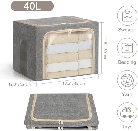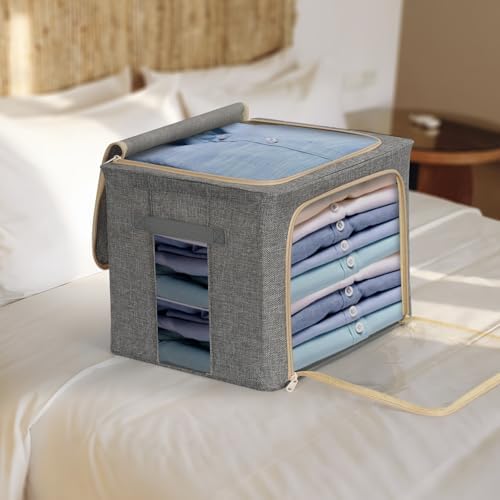 LOVSTORAGE 3-Pack Clothes Storage Bags, Foldable Storage Bins with Metal Frame, Clear Window, Reinforced Handles, Durable Non-Woven Fabric for Clothes, Bedding, Blankets, 40L, Gray