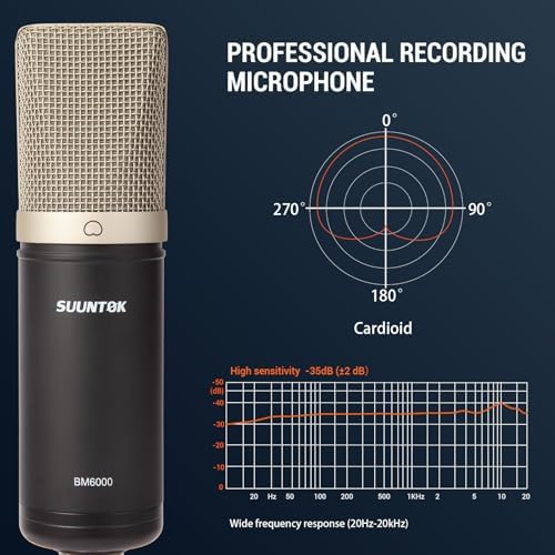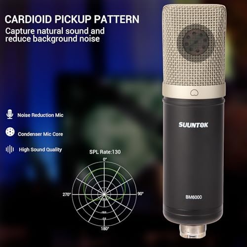 SUUNTOK Condenser Microphone XLR, Large Diaphgram Professional Recording Cardioid Microphone Kit w\/Shock Mount, for Studio, Live Streaming, Podcasting, Voice-Over, You-Tube (Silver)