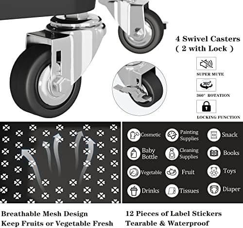 UDEAR 4-Tier Rolling Utility Cart with 12 Category Labels,Multifunctional Storage Shelves with Handle and Lockable Wheels for Room,Office,Kitchen,Bathroom,Black