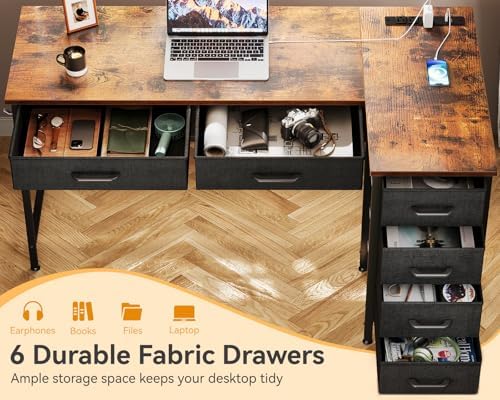 Coleshome 42 Inch L Shaped Desk with Drawers, Computer Desk with Power Outlets, Home Office Desk with 6 Drawers, Reversible Corner Desk for Small Space, Study Work Table with Hook, Vintage