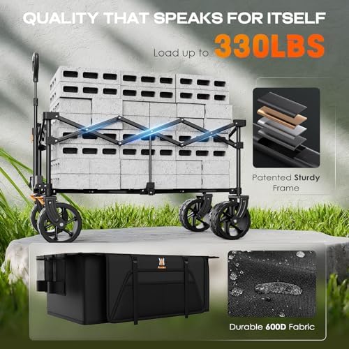 Navatiee Big Wheels Collapsible Wagon Cart Foldable, Heavy Duty Beach Wagon with Silent All-Terrain Wheels, Folding Utility Grocery Cart with Side Pocket and Brakes for Camping Garden Sports, Black
