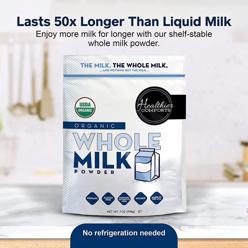 Healthier Comforts Organic Whole Milk Powder Certified USDA Organic Kosher, Gluten Free, Non-GMO Dry Powder Whole Milk Dried Milk w\/Resealable Packaging, Shelf Stable Milk 7oz