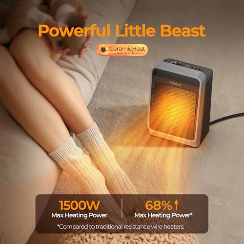 ROSEKM Space Heaters for Indoor Use, 1500W Portable Electric Heater with Thermostat, Ceramic Heater for Room Bedroom Office Under Desk with 3 Heating Levels, Safe Tip-Over Protection