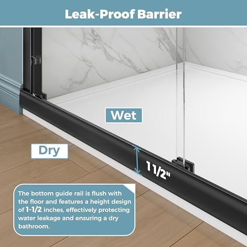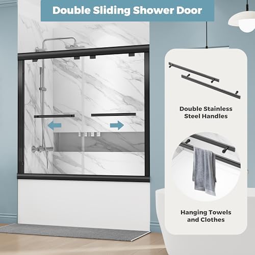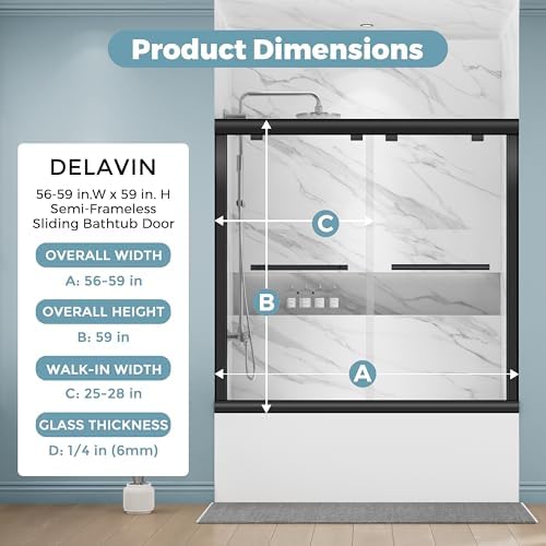 DELAVIN 56-60 in.W x 59 in.H Semi-Frameless Double Sliding Tub Shower Doors, Water Repellent Bypass Black Tub Door, SGCC Clear Tempered Bathtub Doors with Explosion-Proof Film