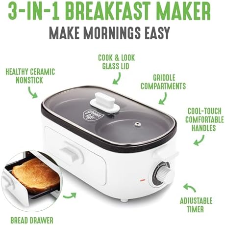 GreenLife 3-in-1 Breakfast Maker Station, Healthy Ceramic Nonstick Dual Griddles for Eggs Meat Sausage Bacon Pancakes and Breakfast Sandwiches, 2 Slice Toast Drawer, Easy-to-use Timer, White