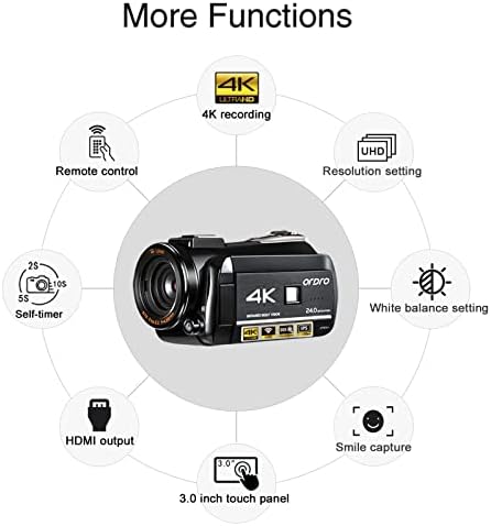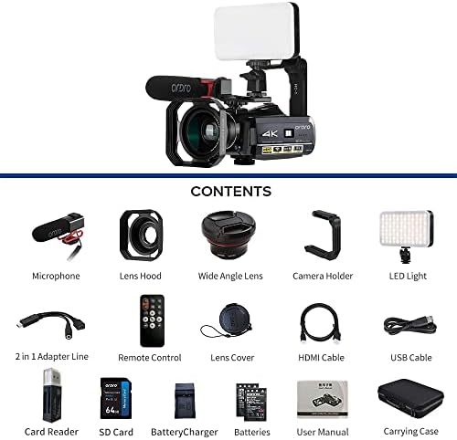 ORDRO UHD 4K Video Camera IR Night Vision Vlogging Camera for YouTube Digital Zoom Recorder with Microphone, Wide Angle Lens, LED Video Light, Handheld Stabilizer, Carrying Case,64GB Memory Card
