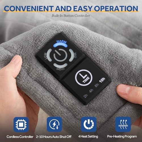 Sealy Heated Blanket Throw with Built-in Button Controller, Reversible Flannel to Sherpa Electric Blanket with 2-10 Hours Auto-Off & 4 Heating Levels, Over-Heat Protection, 50x60 inch, Light Grey