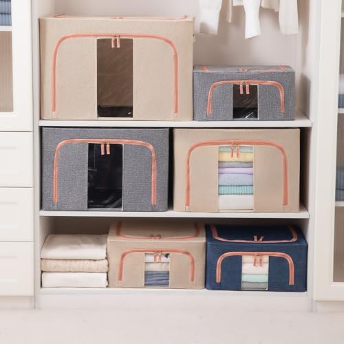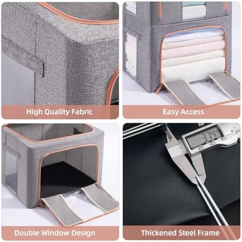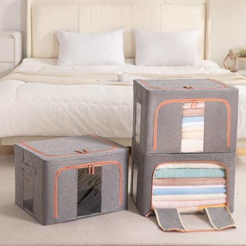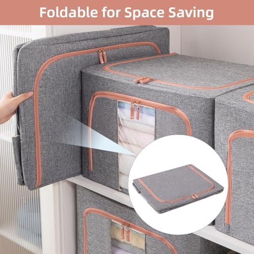 GuliPostan 3 Pack 66L Stackable Clothes Storage Bins with Metal Frame Handles & Zipper, Collapsible Closet Organizer Box with Lid for Bedding Blankets Towel (Grey)
