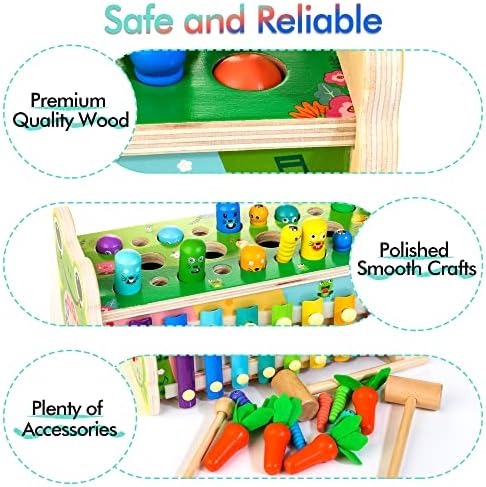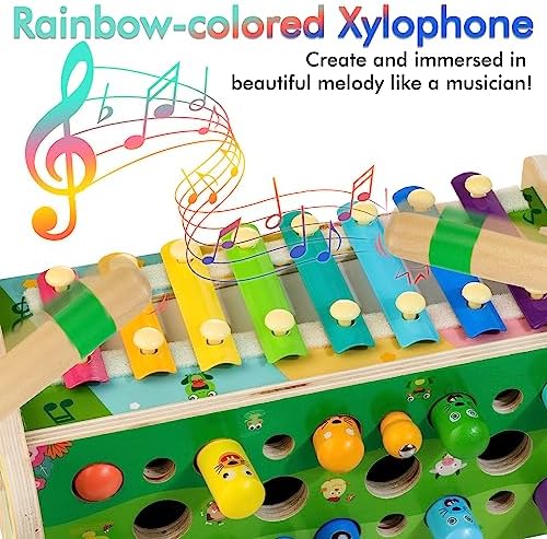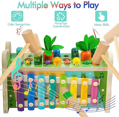 Amtreen 6-IN-1 Wooden Montessori Toys for 1 Year Old, Mole-Tapping Game Play the Xylophone Frog Clock Carrot Harvest Game Spinning Gear, Toddler Toys Aged 1-4, Baby Toy Gift for Early Learning