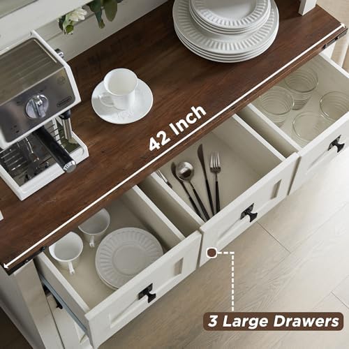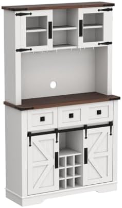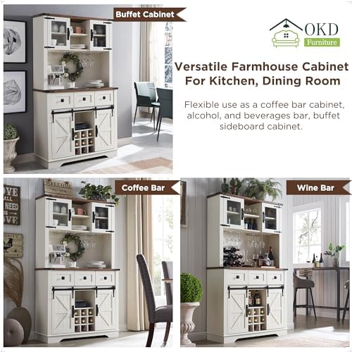 OKD 72" Farmhosue Bar Cabinet with Sliding Barn Door, Large Kitchen Buffet with Hutch w\/Wine & Glasses Rack, 3 Drawers, 12 Storage Shelves, Rustic Coffee Bar Sideboard Table, Antique White
