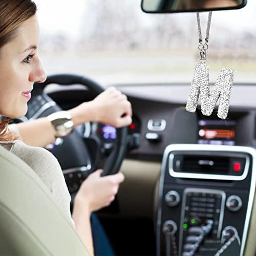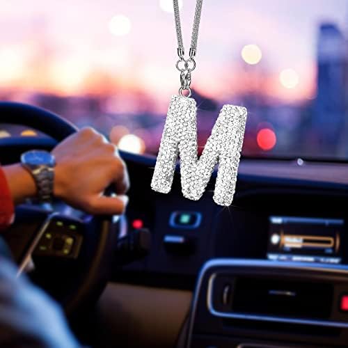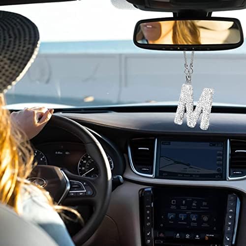 Initial Car Rear View Mirror Ornament Hanging Lucky Crystal Pendant Bling Car Accessories for Women Rhinestone Charm Auto Decoration (White M)