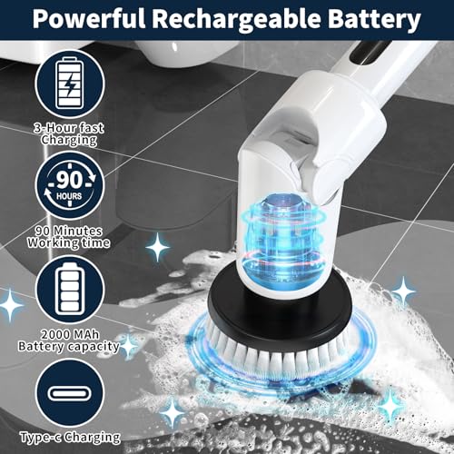 Electric Spin Scrubber - Cordless Cleaning Brush with Digital Display, 2 Speeds, 8 Brush Heads, IPX7 Waterproof, Adjustable Long Handle for Bathroom, Tub, Tile, Shower, and Car