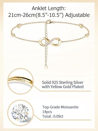 Moissanite Infinity Anklet for Women, Real Authentic 925 Sterling Silver Hypoallergenic, Beautiful Summer Jewelry, Dainty Ankle Bracelet, 8.6-10.6inch (21-26cm) Adjustable