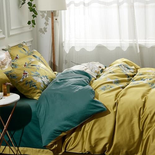 mixinni Garden Style Cotton Flowers and Birds Pattern Printed Duvet Cover Reversible Design Peacock Blue 3 Piece Bedding Duvet Set with Zipper Closure, Perfect for Him and Her-Queen Size