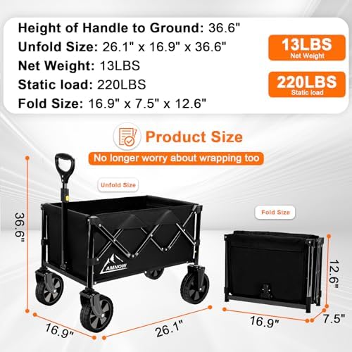Collapsible Wagon Cart with Wheels Foldable, Folding Wagons Carts with Silent Universal Wheels, Large Grocery Cart On Wheels, Heavy Duty Utility for Shopping Beach Sports Fishing Camping, Black