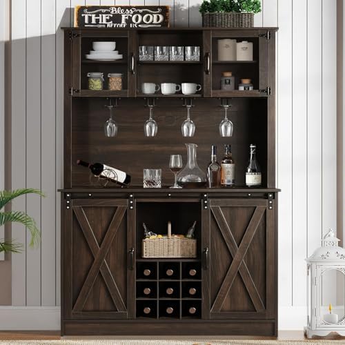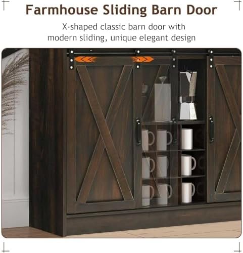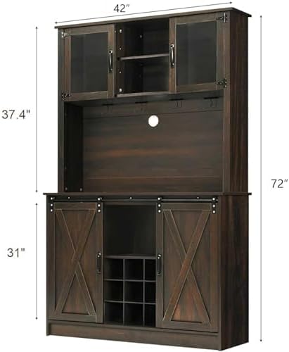 4ever2buy 72" Farmhouse Coffee Bar Cabinet with 2 Glass Doors & 9 Wine Racks, Tall Hutch Cabinet with Storage, Wine Bar with 4 Row Metal Glass Holder, Dark Oak