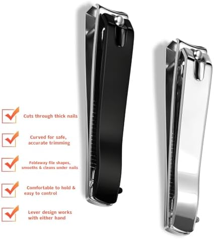 Ucheom Large Nail Clippers 2-Pack, Sharp Stainless Steel Fingernail & Toenail Trimmers with Nail File, Manicure Kit Fingernail Tools for Men & Women, Black and Silver Color