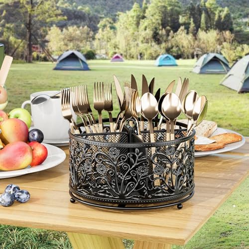 YIUKEA 360° Rotating Utensil Caddy - Silverware Cutlery Caddy Holder with 4 Compartment, Metal Flatware Organizer Countertop with Handle for Party Camping Picnic, Kitchen Counter, Office (Black)
