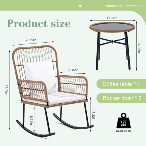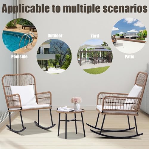 Outdoor Patio Rattan Rocking Chairs Furniture Set, Indoor High Back Rocking Chairs Set of 3, Balcony Chairs Set with Glass Coffee Table and White Cushions, Suitable for Balcony, Front Door, Porch