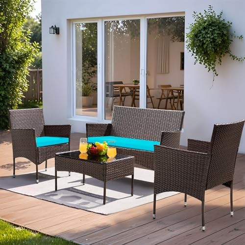 Greesum Patio Furniture 4 Pieces Conversation Sets Outdoor Wicker Rattan Chairs Garden Backyard Balcony Porch Poolside loveseat with Soft Cushion and Glass Table, Brown and Blue