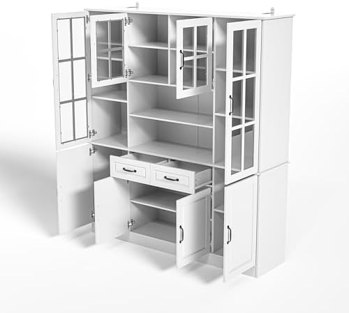 MU Kitchen Storage Cabinet with Glass Doors, Large China Hutch with 2 Drawers & 5 Adjustable Shelves, Kitchen Pantry Hutch for Home Office, Living Room, White (15.8" D x 63" W x 70.9H)