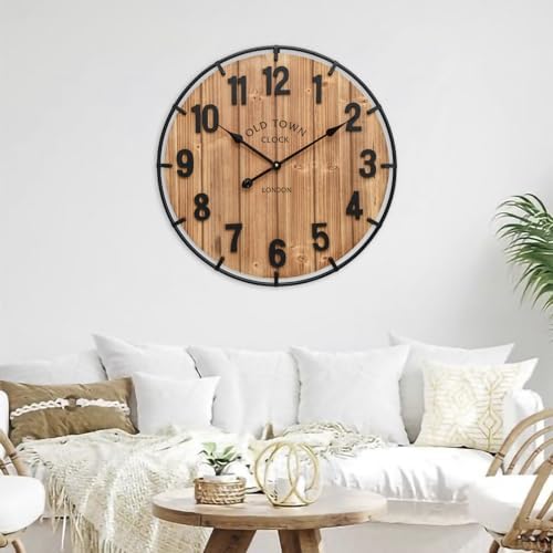 EMAX HOME Large Old Town Farmhouse Wall Clock 24 Inch Rustic Antique Wood with Metal Circle and Large Numerals Silent Battery Operated Wall Clock for Office Kitchen Bedroom Living Room