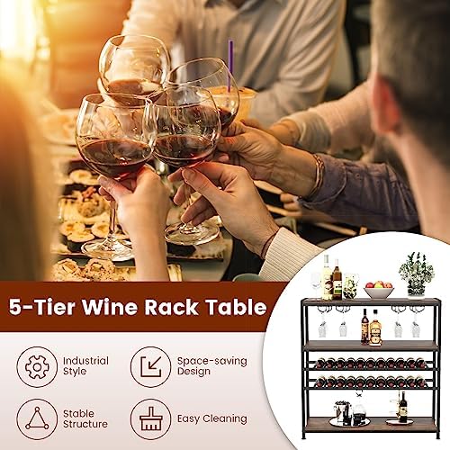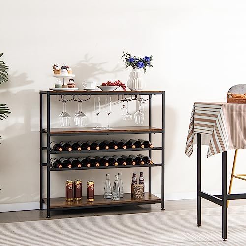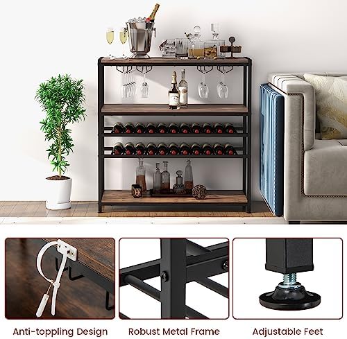 GOFLAME Industrial Wine Rack Table, Wine Bar Cabinet with 2-Tier Wine Rack, 4 Row Glass Holder and Storage Shelves, Freestanding Floor Liquor Storage Stand for Kitchen, Dining Room, Rustic Brown