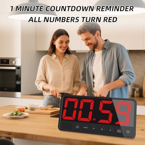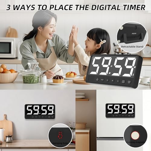 PULIVIA Extra-Large Display Digital Kitchen Timer with 7.4\u201D LED Screen, 6 Alarms & 4 Volume Levels, 3 Memory Presets, Magnetic Stand Rechargeable Count Down\/Up Timer for Cooking Home Gym, Bl