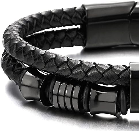 COOLSTEELANDBEYOND Mens Double-Row Braided Leather Bracelet Bangle Wristband with Stainless Steel Ornaments