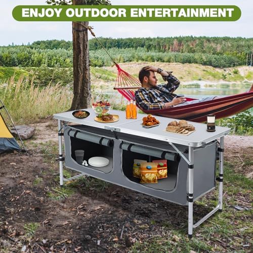 Pnbfhn Outdoor Folding Camping Table with Storage Organizer, Portable Aluminum Composite Panel Lightweight Table, 3 Adjustable Height, for Indoor, BBQ, Party, Picnic, Hiking, Beach