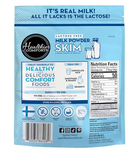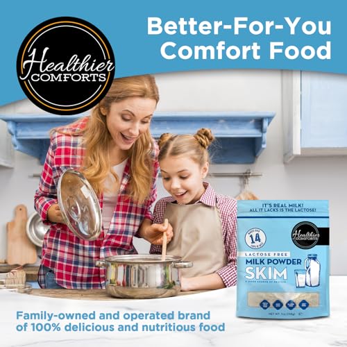Healthier Comforts Lactose Free Skim Milk Powder High Protein, Fat Free, Non-GMO, rBST Hormone Free, Kosher, Gluten Free, No Fillers Baking, Coffee Creamer, Shakes Makes 14 cups (7 oz) (7 oz)