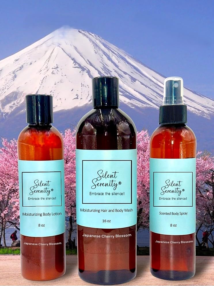 Silent Serenituy Skin Care Set, Moisturizing Body Wash, Moisturizing Body Lotion, Fragrance Body Spray, 3 Piece Gift Set (16 oz, Japanese Cherry Blossom)