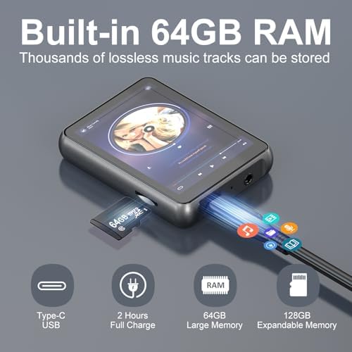 64GB MP3 Player Bluetooth 5.3 Touch Screen Music Player Portable mp4 Player with Speakers high Fidelity Lossless Sound Quality 2.4 inch mp3 FM Radio Recording e-Book