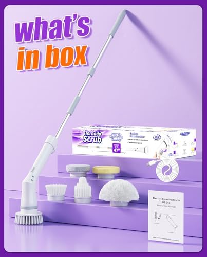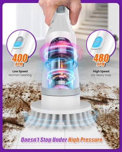 NBONEBS Electric Spin Scrubber, Cordless Shower Scrubber Rotary Floor Brushes & Pad Drivers with 6 Brush Heads - 2H Dual Speed, IPX7 Waterproof Extension Handle for Bathroom Tile Car Cleaning (Whi