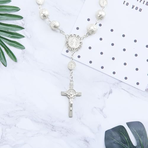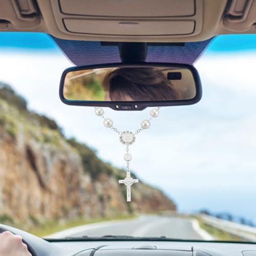 SINGARO Rearview Mirror Hanging Decor - Pearl & Cross Car Charm, Religious Rosary Pendant with Glittering Beads, Faith-Inspired Auto Accessories for Women & Men, Car Interior Accessories