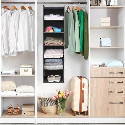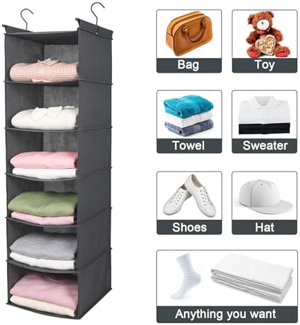 MAX Houser 6 Tier Shelf Hanging Closet Organizer, Closet Hanging Shelf with 2 Sturdy Hooks for Storage, Foldable (Grey)