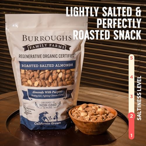 Burroughs Family Farms 3 lb Roasted Salted Almonds \u2013 USDA Organic, First Regenerative Organic Certified Almond Farm \u2013 2x the Antioxidants and Vitamin B Versus Other Almonds \u2013 Lightly Sa