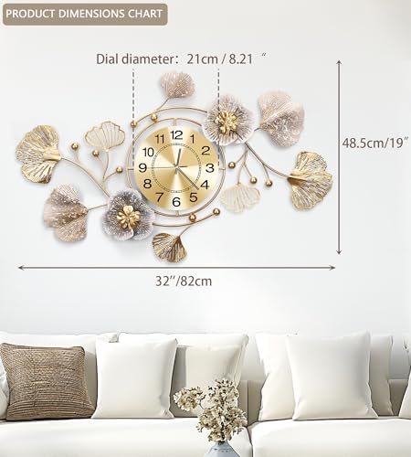 JXQXYN Clocks for Living Room, Large Wall Clock, 3D Silent Wall Clock, Retro Metal Ginkgo Leaf Design, for Bedroom Kitchen Decorative Wall Clocks(32''x18'' )