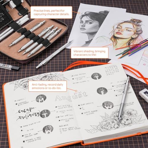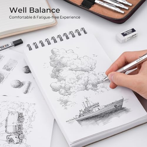 Nicpro 30PCS Silver Metal Mechanical Pencils Set in Leather Case, Art Drafting Pencil 0.5, 0.7, 0.9 mm, 2mm Lead Pencil Holder for Sketching Drawing With 16 Tube (6B 4B 2B HB 2H 4H Colors)Lead Refill