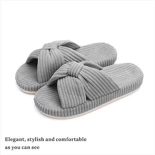 【Sizing Guide】These slippers are elegantly shaped to adorn the line of your feet. Please measure your foot length before purchasing. US 5-6(foot length:9.45"/24cm); US 7-8(foot length:9.84"/25cm); US 9-10(foot length:10.24"/26cm); US 11-12(foot length:10.63"/27cm). If you are 6.5/8.5/10.5, or if you have narrow feet or low insteps, please choose slippers one size down. 【Chantomoo Original Appearance Patented Slippers】The corduroy fabric of these slippers is fine and soft, skin friendly, warm, and non-slip underfoot. Corduroy fabric is combined with bowknot elements to make cross band slippers. The design is unique, classic and simple, with retro and elegant temperament, bright and stylish colors, suitable for all ages and all clothes. The memory foam slippers relax the feet, the platform is supported and not collapsed, and the EVA sole is wear-resistant and non-slip. At the same time, these materials make it very light, like walking on the cloud. These slippers are suitable for all scenes, indoor, bedroom, shopping, walking, party, travel, wedding, etc. Packaged in a unique and adorable shoebox, it makes the perfect slipper gift. Open toe slippers are breathable, lightweight, quiet, suitable for all seasons, perfect house slippers. ★Easy care, machine wash or hand wash, air dry, do not bleach.