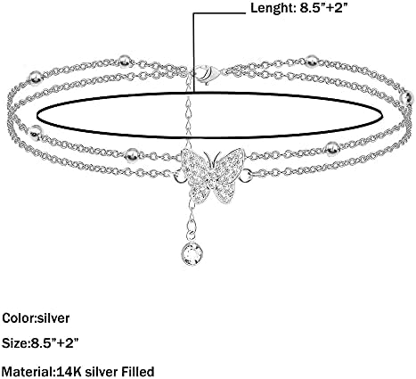 14K Butterfly Silver - Adjustable Layered - Jewelry Anklet Gifts for Women Teen Girls