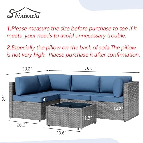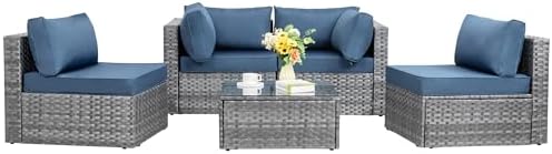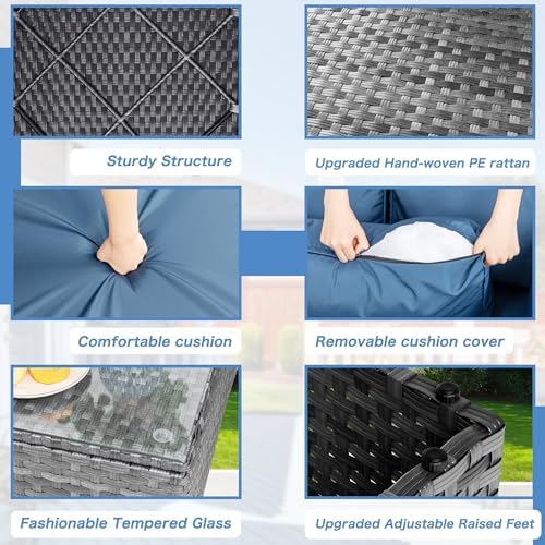 Shintenchi 5 Pieces Outdoor Patio Sectional Sofa Couch, Silver Gray PE Wicker Furniture Conversation Sets with Washable Cushions & Glass Coffee Table for Garden, Poolside, Backyard (Aegean Blue)
