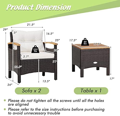 Tangkula 3-Piece Patio Furniture Set, Patiojoy Outdoor Rattan Sofa Set with Coffee Table, Patio Conversation Set with Removable Cushion, Cozy Acacia Wood Armrests for Backyard, Poolside (Off White)