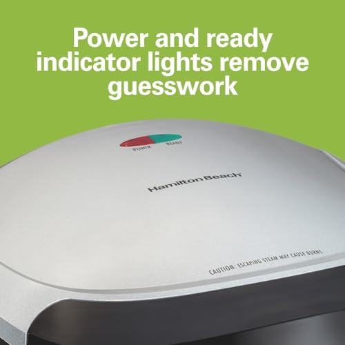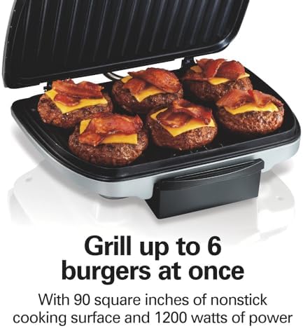 Hamilton Beach Electric Indoor Grill, 6-Serving, Large 90 sq. in. Nonstick Easy Clean Plates, Floating Hinge for Thicker Foods, 1200 Watts, 6.38"D x 12.68"W x 13.78"H , Silver (25371)