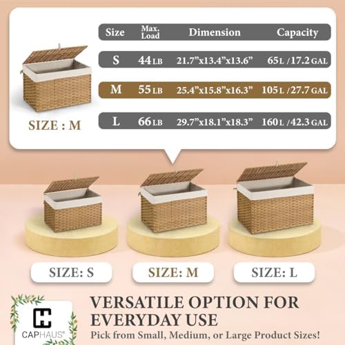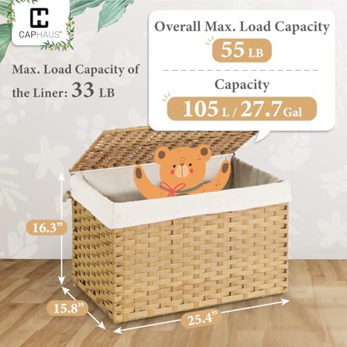 CAPHAUS Laundry Basket w\/Lid, Synthetic Rattan Laundry Hamper w\/Lid and Handles, 2 Removable Liner Bags, Foldable Clothes Hamper for Laundry, Large Storage Basket w\/Lid, 105L, Natural