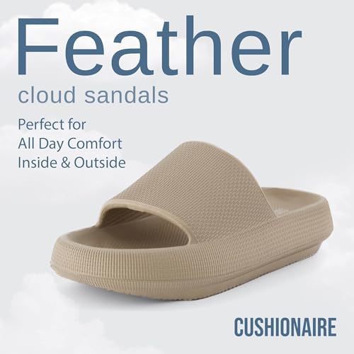 CUSHIONAIRE Feather EVA Slides for Women \u2013 Comfortable Slip On Womens Slippers, Indoor Outdoor Shower Shoes, Beach Essential Cloud Slides