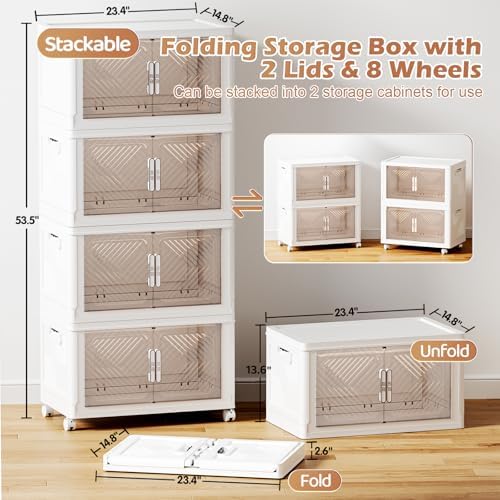 pioncrey Storage Bins with Lid 76QT, Stackable Storage Containers with Wheels and Magnetic Doors, Plastic Clothes Closet Organizers and Storage Box for Pantry, Home and Office (4 Pack)